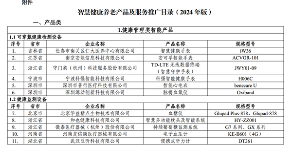 (一)智慧健康养老产品。主要包括六类产品及多种产品集成应用的场景化解决方案。六类产品为:具有趋势分析、智能预警等功能的健康管理类智能产品;功能代偿型等老年辅助器具类智能产品;具有行为监护、安全看护等功能的养老监护类智能产品;具有健康状态辨识、中医诊断治疗等功能的中医数字化智能产品;围绕助老助残、家庭生活需求的家庭服务机器人;实施适老化改造的智能产品。